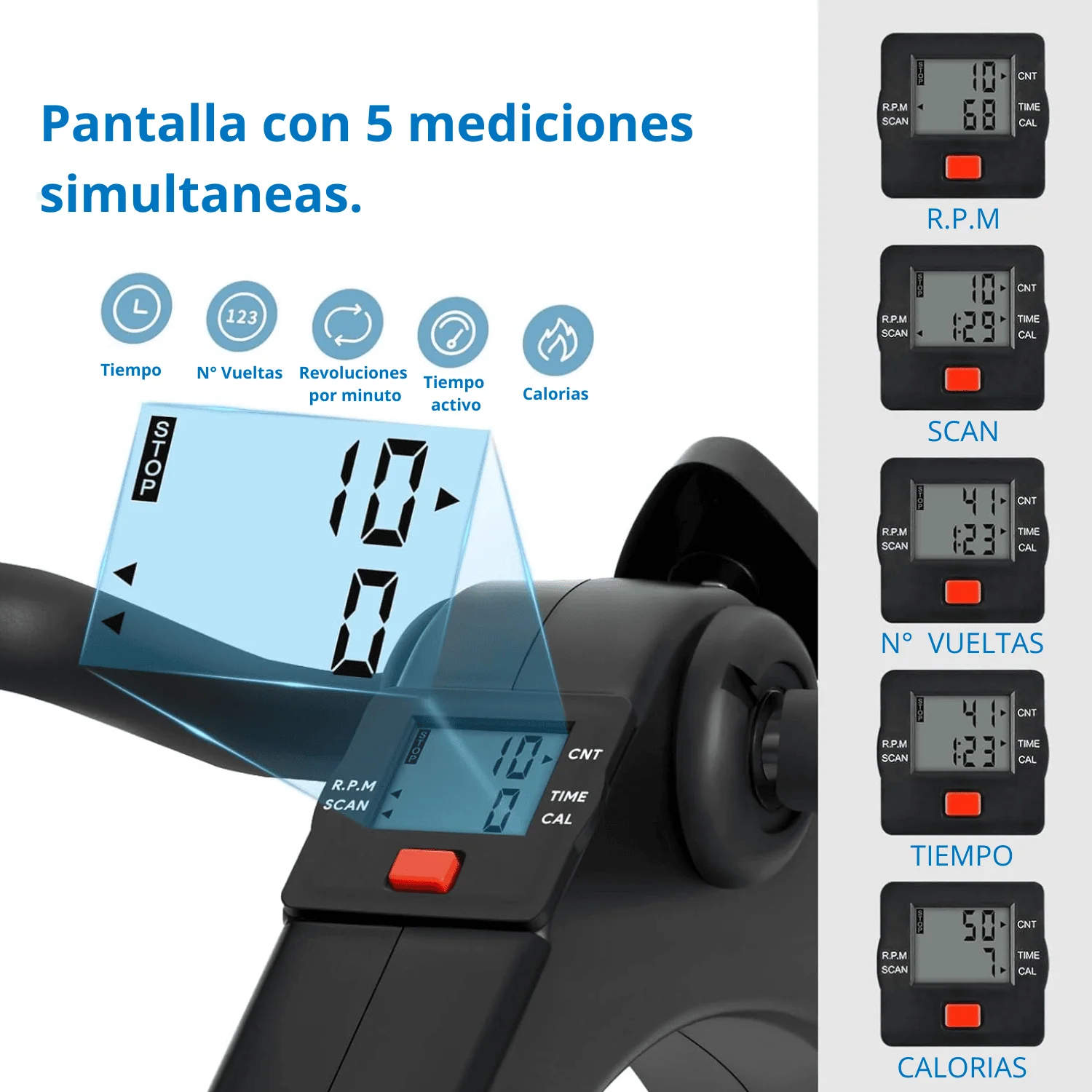 Pantalla LCD con 5 funciones: Tiempo, cuenta, RPM, calorías y escaneo.
