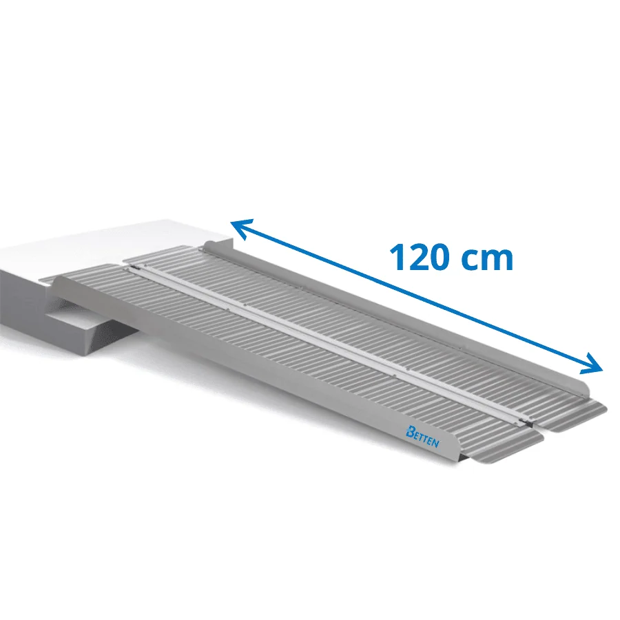 Dimensiones y Capacidad: La Rampa de Aluminio Betten tiene una anchura de 71 cm y una longitud de 120 cm, proporcionando un amplio espacio para una transición suave y segura. Con una capacidad de carga de hasta 300 kg, esta rampa es capaz de soportar un uso intensivo sin comprometer su integridad estructural.