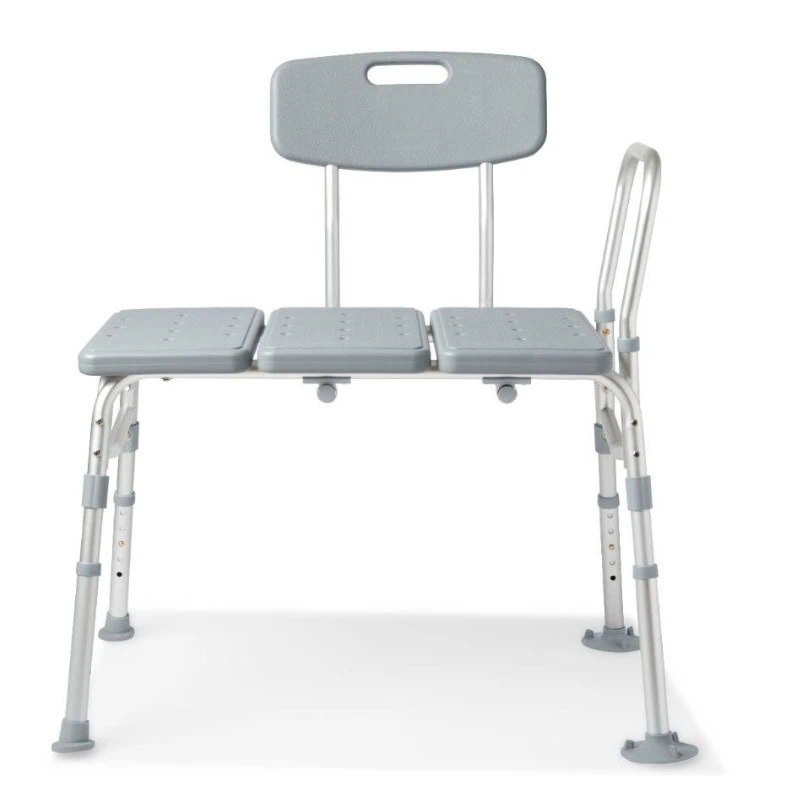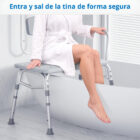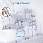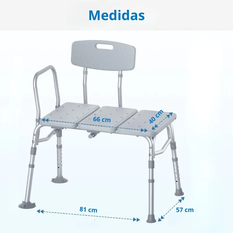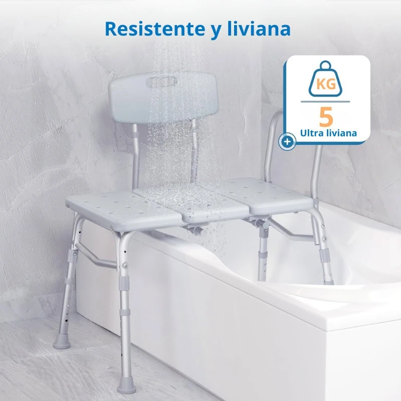 El asiento cuenta con respaldo reversible, permitiendo instalarlo según la orientación de la tina, y un reposabrazos fijo que brinda apoyo adicional al sentarse o levantarse. Sus patas con ventosas antideslizantes se adhieren firmemente al fondo de la tina, evitando movimientos peligrosos y asegurando estabilidad completa durante la transferencia.